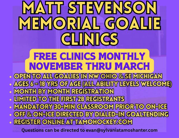 FREE goaltending clinics offered once per month to all goalie from NW Ohio & SE Michigan ages 6 thru 18 years of age. Spaces are limited. Registration runs month by month.